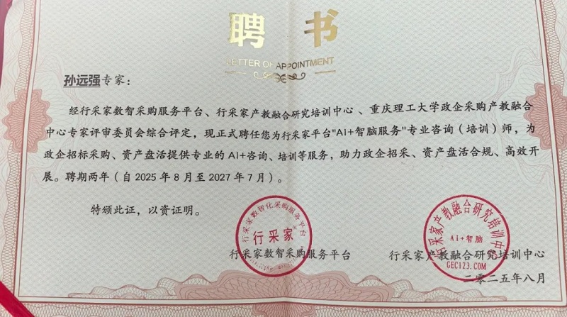 会上,行采家数智采购服务平台与行采家产教融合研究培训中心正式聘请重庆捷讯律师事务所高级合伙人孙远强、孙源律师为政企招采培训专家,聘期两年。两位律师在招采合规、风险防控及争议解决领域深耕多年,参与起草多部行业标准,此次受聘将为行采家后续课程研发、师资培养及政企培训注入权威法律力量。