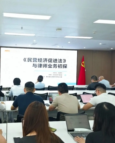 最后,会议进入“《民营经济促进法》与律师业务初探”专题分享环节。该环节由律所合伙人张庆华律师担任主讲,他围绕《民营经济促进法》的立法背景、过程、亮点、结构及核心内容进行了深入解读,并系统梳理了该法为律师业务带来的机遇,涵盖行政业务、民事业务、刑事业务、合规业务、法律顾问服务以及多元化调解(包括行政调解、商事调解)等多个领域。分享最后,他还就《民营经济促进法》背景下律所及律师的发展策略提出了针对性建议。