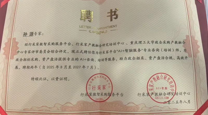 会上,行采家数智采购服务平台与行采家产教融合研究培训中心正式聘请重庆捷讯律师事务所高级合伙人孙远强、孙源律师为政企招采培训专家,聘期两年。两位律师在招采合规、风险防控及争议解决领域深耕多年,参与起草多部行业标准,此次受聘将为行采家后续课程研发、师资培养及政企培训注入权威法律力量。